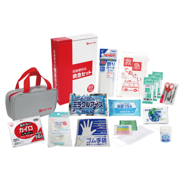 | 商品の特徴 | 持ち運びに便利な収納ポーチ付きの救急セット。本棚や引き出しに備蓄しやすいB5サイズの箱入りです。災害時やいざという時にあると役立ちます。 | ||