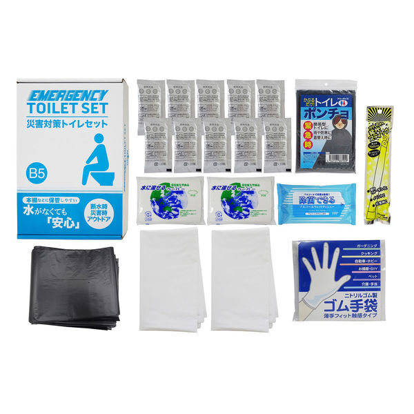 | 商品の特徴 | 水が無くてトイレが使えなくても、排泄物の処理ができる簡易トイレセットです。便座に袋をセットして、排便後に凝固剤(抗菌剤入)を振りかけて固めます。本棚や引き出しに備蓄しやすいB5サイズの箱入りです。災害時・断水時の備蓄に役立ちます。あると便利なトイレポンチョやゴム手袋入り。 | ||
