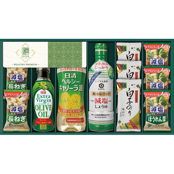 - ●キッコーマンいつでも新鮮味わいリッチ減塩しょうゆ450ml、アマノフーズフリーズドライ減塩いつものおみそ汁(ほうれん草×3・長ねぎ×2)、白子のり味のり(8切5枚)×3、日清ヘルシーキャノーラ油380g、日清エキストラバージンオリーブ油145g