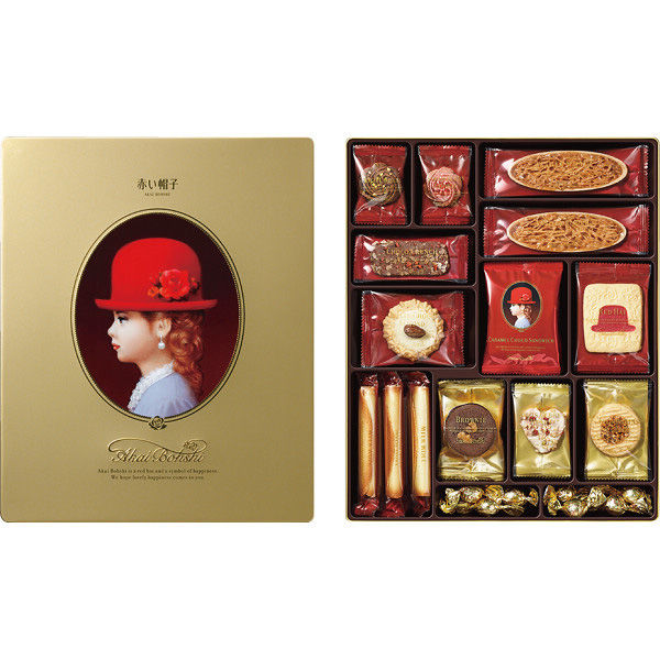 - ●ホワイトチョコボール×12、ミルクロール×9、バニラアーモンド×8、ナッツベリーハート・チョコクランチ・レッドハット・フロランタンクッキー×各5、ストロベリークッキー・チョコクッキー・ホワイトチョコアーモンド×各4、キャラメルショコラサンド×3、ブラウニー×2(計12種66個入)※包装済み商品です。