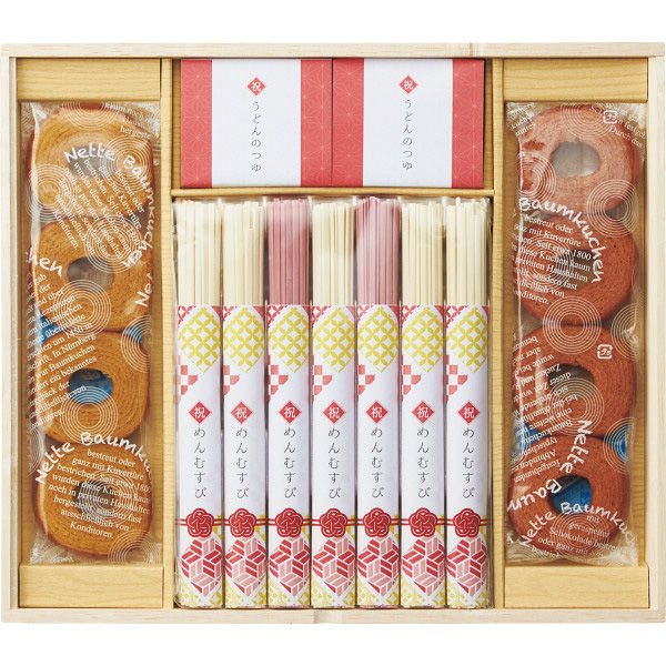 | 商品の特徴 | 幸せのご縁を結ぶように、幸福の引菓子バウムクーヘンと紅白うどんの詰合せ。和洋の味が楽しめるちょっと贅沢な贈り物です。 | ||