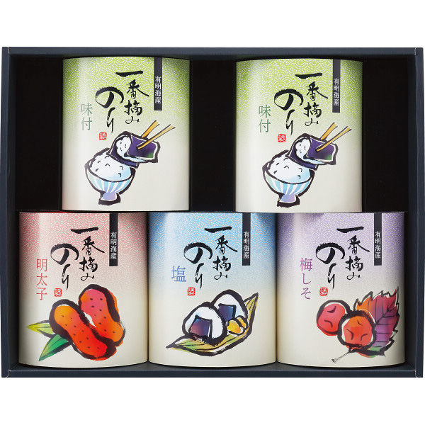 | 商品の特徴 | 栄養素が豊富な有明海の漁場で今年初めて摘み獲られた貴重な海苔「一番摘み海苔」。味付、明太子、梅しそ、塩の4種類のフレーバーをセット一番摘みならではの柔らかく風味豊かでパリッとした食感と口どけの良さが特徴の美味しい海苔の詰め合わせです。 | ||
