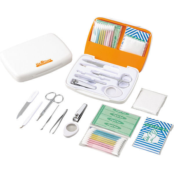| 内容量 | ●専用ケース・グルーミング7点セット(爪切り・エチケットハサミ・耳カキ・爪ヤスリ・毛抜き兼ピンセット・キューティクルカッター・ルーペ)・キズテープ3P(医療機器届出番号:27B3X00138000001)・綿棒10P・ワンタッチ包帯・コットンパフ3P×各1 | ||
