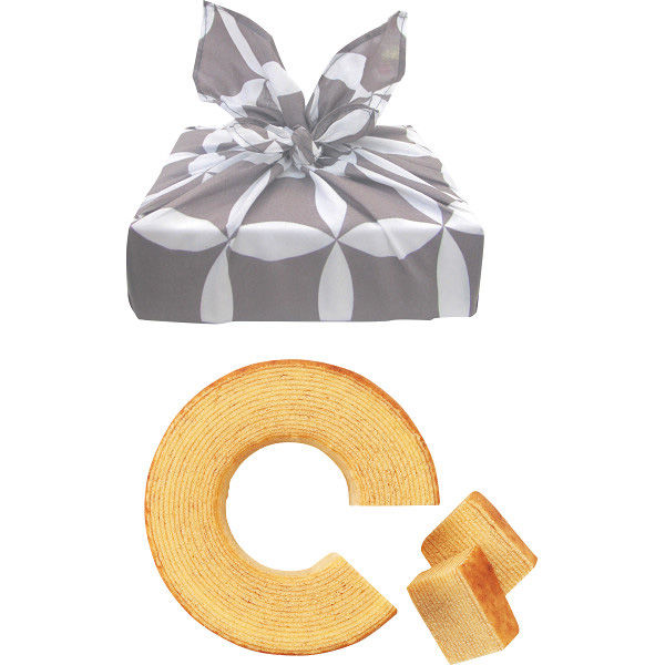 - ●バウムクーヘン(北海道産生乳100%の生クリーム使用)(14.3Φcm)×1、風呂敷(約46.5×46.5cm・綿100%・中国製)×1