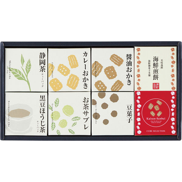 - ●静岡深蒸茶ティーバッグ(2.5g×7P)×1、黒豆ほうじ茶ティーバッグ(2.5g×7P)×1、海鮮せんべい20g×1、お茶サブレ(3枚入)×1、たまり醤油おかき24g×1、カレーおかき24g×1、豆菓子(黒ごま味)45g×1