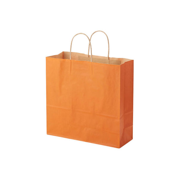商品の特徴 クラフト紙にオレンジベタを印刷した手提げ紙袋です。色落ちを緩和させるために、上からニスを塗布しています。幅と高さがほぼ正方形のオールマイティモデル。●手紐:丸紐未晒●入数:50枚