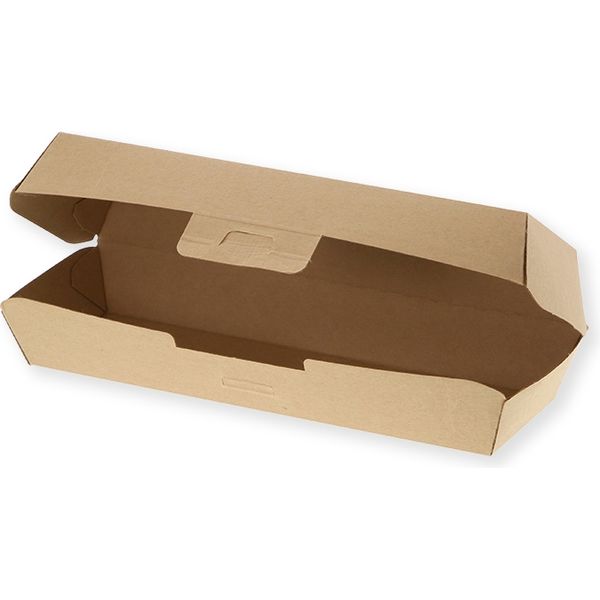 ナチュラルなクラフトテイストの食品箱です。ホットドッグやスイーツなどのテイクアウトやデリバリーに使用できます。成型された状態で包装された商品です。