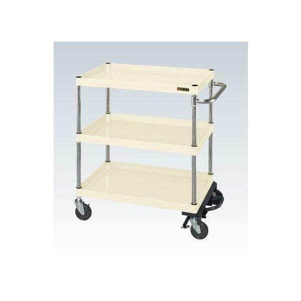 | 質量 | 34kg | 商品特徴 | ●ボルトレスで組立簡単。棚板を逆さにするだけで、皿型・フラット型と組み替えることができます。安価で耐久性に優れるゴム車を採用。ワンタッチでワゴンを止めるフットブレーキ付です。 |