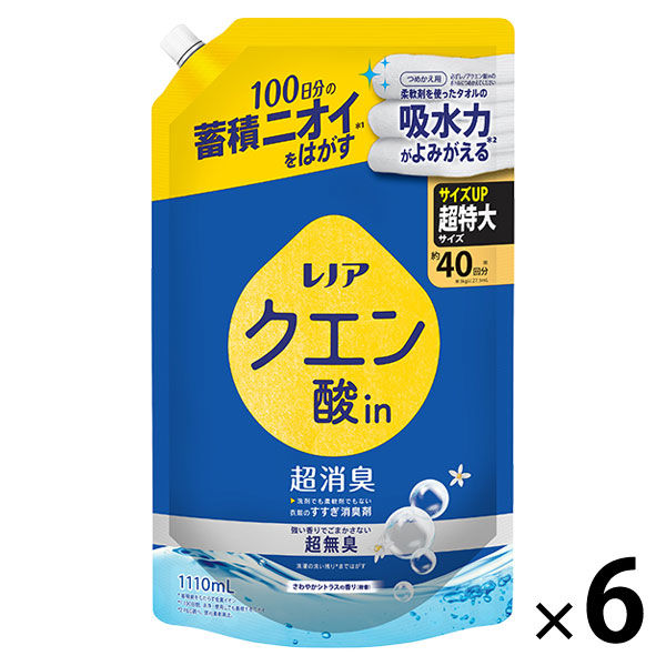 レノア クエン酸in 超消臭 衣類のすすぎ消臭剤 強い香りでごまかさない超無臭 さわやかシトラス 詰め替え 超特大 1110mL 1セット(6個) P&G