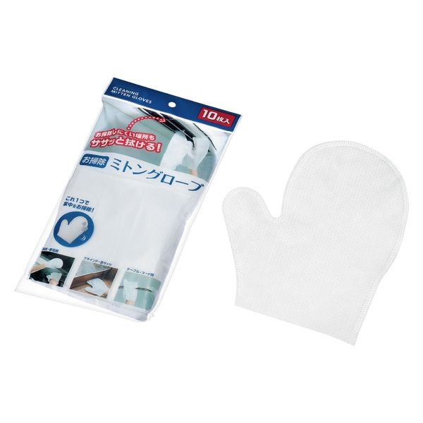 お掃除ミトングローブは、手にはめて使うことができる不織布製の掃除手袋です。1枚のサイズは約23.5×20cmで、10枚入りの使い捨てタイプです。