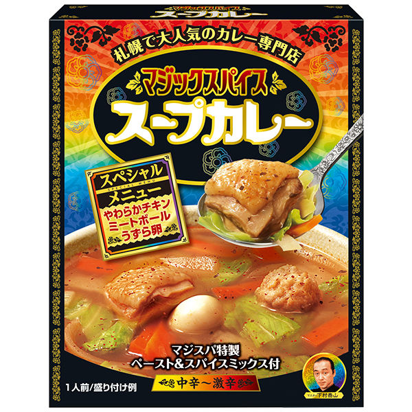 | 商品の特徴 | 札幌「スープカレー」の名付け親であり、熱狂的に支持され続けるマジックスパイス。野菜や魚介の旨みが凝縮したスープに秘伝のスパイスが複雑にからみあった奥の深い味わい。特別に下ごしらえした“やわらかジューシー”な鶏もも肉と色とりどりの具材のおいしさが際立ちます。別添の「特製ペースト&スパイス」で自分好みの辛さをお楽しみください。【レトルト食品】 | ||