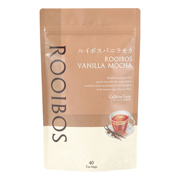 カフェインレス(0.00%)。ほんのりビターなカフェモカと、ふんわり香るバニラがベストマッチのルイボスティー。