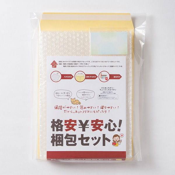 | 商品の特徴 | A4サイズの紙がすっぽり収まる大きさの角形2号封筒と、角形2号封筒に収まる緩衝袋の各5枚セットです。名刺4号サイズのメッセージカードがおまけで付いています。フリマサイトの梱包に便利です。緩衝材は単体で袋状になっているため、別の袋にいれる事もできます。これ1つで梱包から発送までの必要な材料が揃っているので持っているだけで安心です。●セット内容:封筒5枚・緩衝袋5枚・メッセージカード5枚 | ||