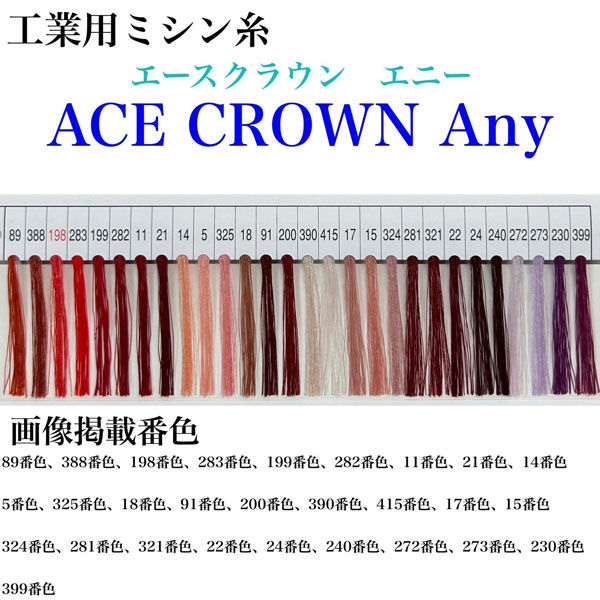 | 商品の特徴 | エースクラウン「Any」は、高強力、高伸度の66ナイロン100%の工業用ミシン糸です。高いストレッチ性を持っており、伸縮性のある素材、ニット等幅広く対応出来ます。「エースクラウン」ミシン糸シリーズ共通のカラーにて展開していますので、併せてご利用ください。 | ||