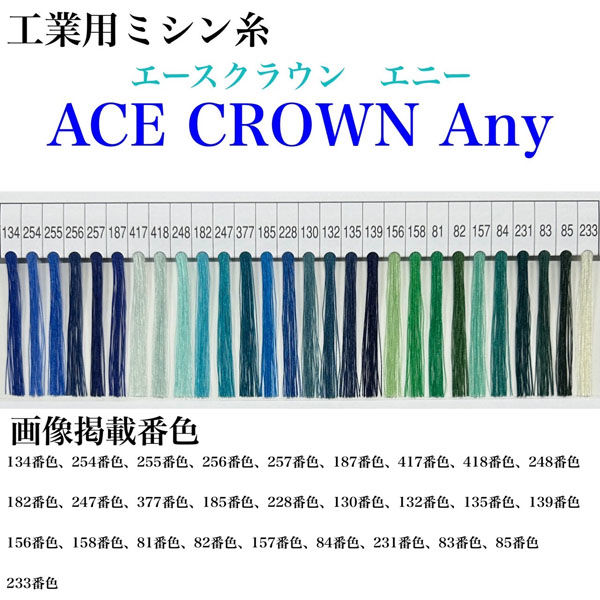 | 商品の特徴 | エースクラウン「Any」は、高強力、高伸度の66ナイロン100%の工業用ミシン糸です。高いストレッチ性を持っており、伸縮性のある素材、ニット等幅広く対応出来ます。「エースクラウン」ミシン糸シリーズ共通のカラーにて展開していますので、併せてご利用ください。 | ||