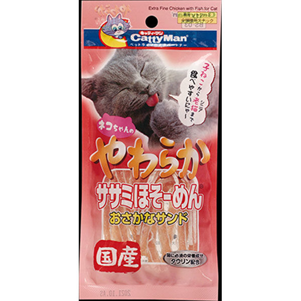 - 鶏ささみ、魚肉加工品、糖類、グリセリン、ソルビトール、酸化防止剤(エリソルビン酸Na、亜硫酸Na)、ミネラル類(ナトリウム)、リン酸塩(Na)、調味料、保存料(ソルビン酸カリウム)、タウリン、発色剤(亜硝酸ナトリウム)