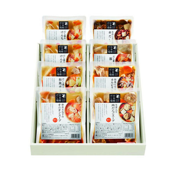 - だし薫るけんちん汁190g×2、だし薫る和風ポトフ・なめこと豆腐の赤だし・生姜入り肉だんごスープ・和風ピリ辛カルビスープ・炒め玉ねぎのオニオンスープ・だし薫る豚汁各190g