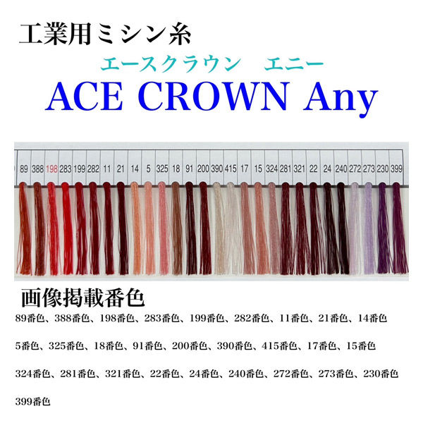 | 商品の特徴 | エースクラウン「Any」は、高強力、高伸度の66ナイロン100%の工業用ミシン糸です。高いストレッチ性を持っており、伸縮性のある素材、ニット等幅広く対応出来ます。「エースクラウン」ミシン糸シリーズ共通のカラーにて展開していますので、併せてご利用ください。 | ||
