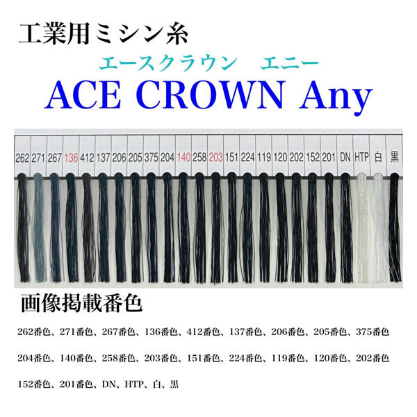 | 商品の特徴 | エースクラウン「Any」は、高強力、高伸度の66ナイロン100%の工業用ミシン糸です。高いストレッチ性を持っており、伸縮性のある素材、ニット等幅広く対応出来ます。「エースクラウン」ミシン糸シリーズ共通のカラーにて展開していますので、併せてご利用ください。 | ||