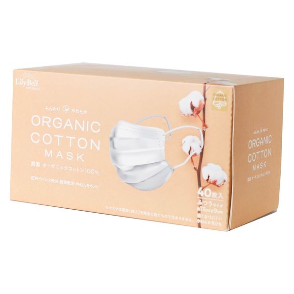 敏感肌マスク 肌面オーガニックコットン100%不織布 ふつうサイズ 1箱(40枚入)柔らか耳紐 平ゴム Lily Bell