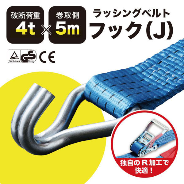 様々な業種で使用される! ラッシングベルト Jフックタイプ。破断荷重はラインナップの中でも一番高い約4000kg