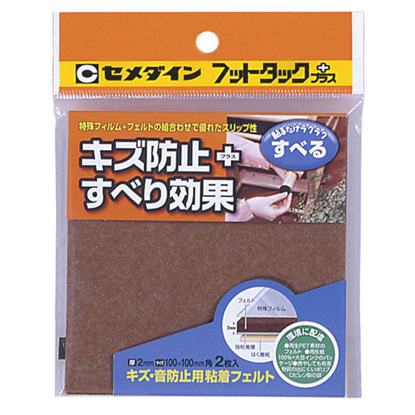 キズ・音防止用粘着フェルト。特殊すべりフィルムを加工してあるので滑らせて動かすことができます。100mm×100mm、ブラウン。