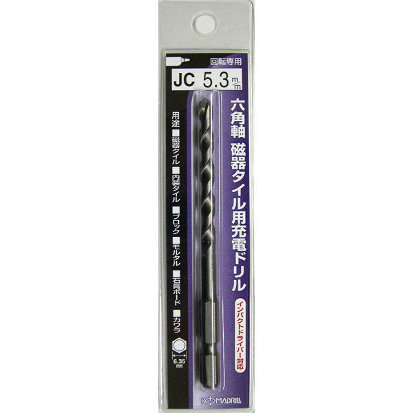 | 使用適合機種 | インパクトドライバー(12V以上)。充電ドリルドライバー(12V以上)。電気ドリル(450W以下)回転モードでご使用ください。 | 用途 | 磁器タイル・内装タイル・ブロック・モルタル・ 石膏ボード・カワラの穴あけに。 |
