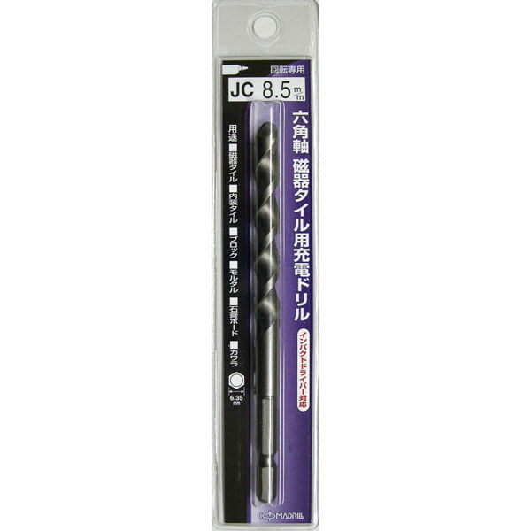 | 使用適合機種 | インパクトドライバー(12V以上)。充電ドリルドライバー(12V以上)。電気ドリル(450W以下)回転モードでご使用ください。 | 用途 | 磁器タイル・内装タイル・ブロック・モルタル・ 石膏ボード・カワラの穴あけに。 |