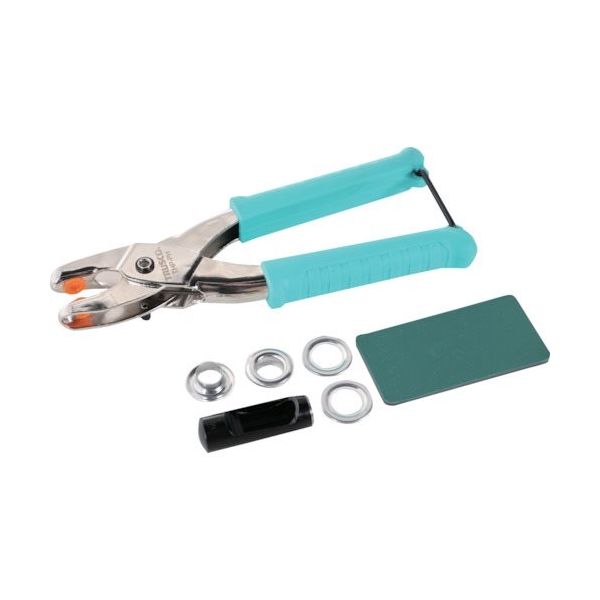 - ●両面ハトメ取付け作業に必要な工具が一式揃ったセットです。●セットは4mm、5mm、7mm、8mm、10mm、12mmの6サイズ展開です。必要なハトメコマのサイズで選んで下さい。●コマは付属のハトメサイズに適合するサイズの物がついています。●コマは交換式で、別売のTHP-K4~THP-K15Nのお好きなものに取り換えが可能です。コマのサイズを変えることで、使えるハトメサイズも変えることができます。●セット内容:●ハトメパンチ プライヤー型(THP-PH)●アルミ製両面ハトメ12mm(10組)●専用ハトメコマ(THP-K12N)●下穴用ポンチ●下敷き