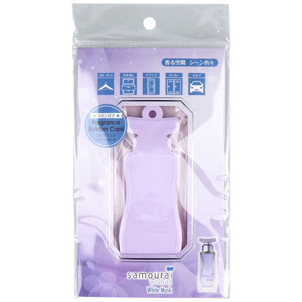 | 商品の特徴 | ●クローゼット・お部屋・車にも、使い方いろいろ! ●カードタイプのお部屋用マルチフレグランス! ●お部屋・オフィス・車・ジムや学校で。 ●香水瓶をかたどったゴム素材を採用。 ・一般的な紙素材に比べ耐久性に優れます。 ・本体の香りが長持ち。 ・経過と共に使用シーンを変えて長く香りを楽しめる。 ●リボン付き。 ●明るく優雅で清潔感あふれた、上品な甘さの「サムライウーマン ホワイトムスク」の香り♪ | ||