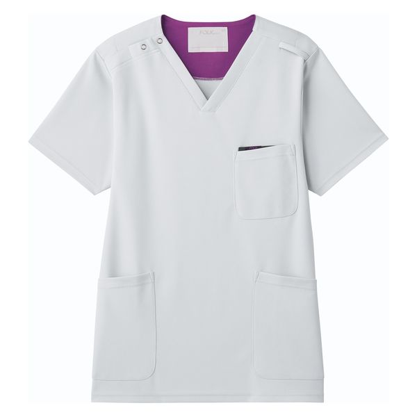 | 商品の特徴 | 2重胸ポケット、腰ポケットも大きめのサイズ感で収納力があります。後両裾のスリットは消毒用アルコールを腰につける際に、綺麗に収まります。スリットとしての機能もあるので、しゃがんだりする姿勢の時も足さばきが良く、動作がスムーズになります。背面見返し部分の配色が着用時に衿ぐりからちらっと見えるおしゃれなデザインです。白に変わる新しい色としてライトグレーを展開、パープルやターコイズも患者様が分かりやすい発色となっています。用途によってオールニットの提案が可能です。 | ||
