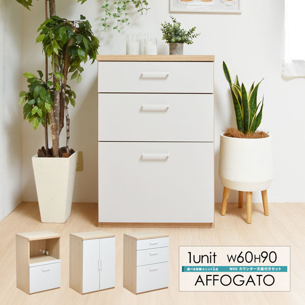 | 商品の特徴 | AFFOGATO(アフォガード) 大きさ違いの引き出しが3段ついたチェスト、コンセント付きのオープン引出、可動棚が便利な開き戸の3種類からお選びいただけます。引き出しはどれもスライドレール付きで、重いものを入れても楽に開閉が可能。白×木目調のオレフィンシートで仕上げられたシンプルな見た目は、どんな雰囲気にも馴染みます。 | ||