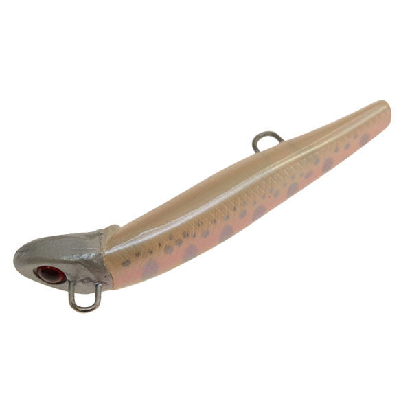 | 商品の特徴 | ヘッド部が鉛のソリッド、ボディ部が樹脂のソリッドという独自の構造を持ち、ボトムまで沈めてやや大きめの連続トゥイッチを加えると、唯一無二の切れ味の鋭い3Dアクションを発生。そのアクションにより、トラウト達は他のルアーでは見せない、狂ったような反応を示します。 | ||