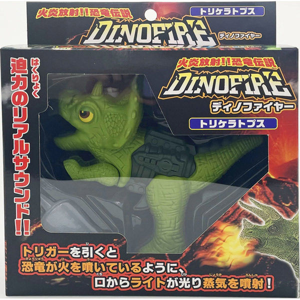 | 商品の特徴 | 迫力のリアルサウンド。口から火を噴くようにして遊べる『ディノファイヤー』水を入れてトリガーを引くと、恐竜が火を噴いているように、口からライトが光り蒸気を噴射します。大人気の恐竜に心くすぐられるギミックが付いたアイテムです。■Size:約W165×H145×D45mm■種類:2種&2種AS■備考:単三電池×2本使用(別売)■材質:ABS■重量:約192g | ||