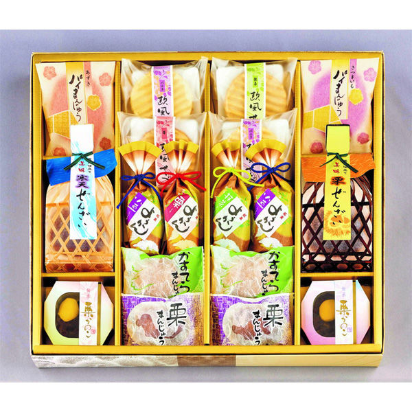 - パイまんじゅう28g(あずき・さつまいも×各1)、欧風せんべい25g(バニラ×2、苺・抹茶×各1)、寒天ぜんざい120g(小豆・栗×各1)、ようかん60g(小豆×2、抹茶・栗×各1)、栗かのこ80g・かすてらまんじゅう28g・栗まんじゅう28g×各2