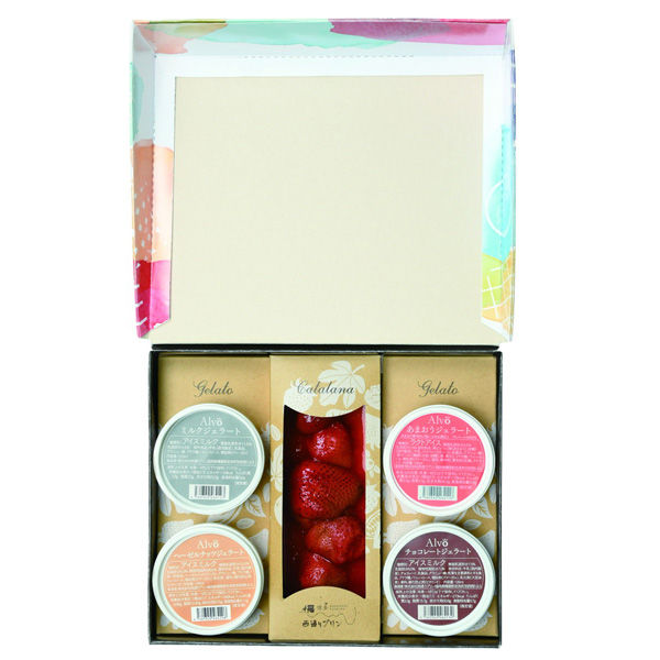 - 福岡県産あまおう苺入りカタラーナ285g・ミルクジェラート120ml・チョコレートジェラート120ml・ヘーゼルナッツジェラート120ml・あまおうジェラート120ml