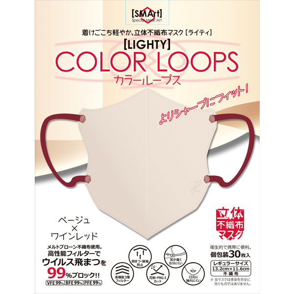 - ●カラー:ベージュ×ワインレッド。●入数:30枚。●衛生的で携帯に便利な個包装。●メルトブローン不織布使用。●高性能フィルターでウイルス飛沫を99%ブロック。●VFE99%。BFR99%。PFE99%。●原産国:中国。