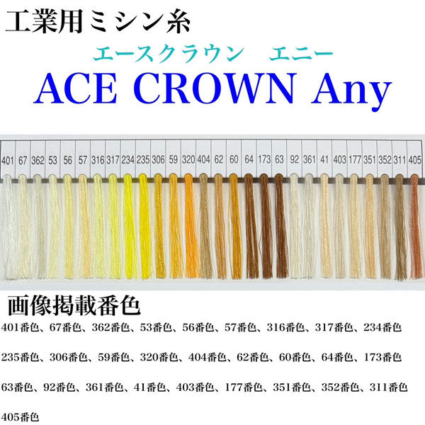 | 商品の特徴 | エースクラウン「Any」は、高強力、高伸度の66ナイロン100%の工業用ミシン糸です。高いストレッチ性を持っており、伸縮性のある素材、ニット等幅広く対応出来ます。「エースクラウン」ミシン糸シリーズ共通のカラーにて展開していますので、併せてご利用ください。 | ||