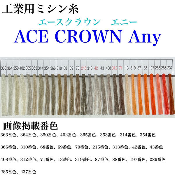 | 商品の特徴 | エースクラウン「Any」は、高強力、高伸度の66ナイロン100%の工業用ミシン糸です。高いストレッチ性を持っており、伸縮性のある素材、ニット等幅広く対応出来ます。「エースクラウン」ミシン糸シリーズ共通のカラーにて展開していますので、併せてご利用ください。 | ||