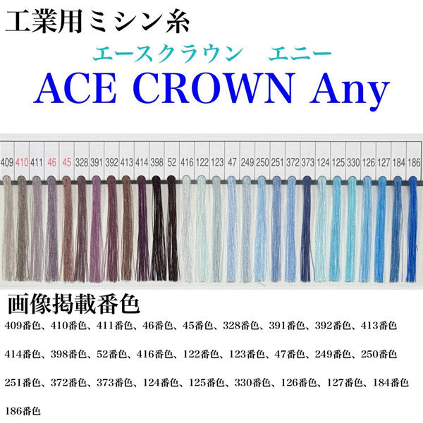 | 商品の特徴 | エースクラウン「Any」は、高強力、高伸度の66ナイロン100%の工業用ミシン糸です。高いストレッチ性を持っており、伸縮性のある素材、ニット等幅広く対応出来ます。「エースクラウン」ミシン糸シリーズ共通のカラーにて展開していますので、併せてご利用ください。 | ||