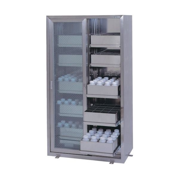 - ●ステンレスボトルトレーやプレートは引き違い戸枠で飛び出しをしっかりガード。前面ガラスもワイヤー入りにし飛散を防止します。●レールは音の静かな消音バンパー付3メンバーフルトラベルレールを採用。棚板(プレート)を軽いタッチで操作できます。●レールに接続されたプレート(棚板)を押し込むとロックがかかり。レールと棚板は収納されます。ロックされたレール・棚板を引き出す時は、軽く力を入れ手前に引き出さなければ動かない安全設計です。●2分割された庫内は利用者別管理や試薬瓶の種類別管理に最適です。●スーパーアネックス薬品庫ANX-300G●セット内容:●ボトルトレー(500mL×20本立)10個●プレート(用途:ボトルトレー受皿、機器類や器具類の収納)10個●アキュライドレール/鉄に亜鉛メッキ仕上:24本付属(12ペア)●引出し:2個 ※写真のポリ瓶は含まれません。●転倒防止金具(前面2箇所・側面2箇所・天板2箇所)※アンカーボルト、ビス類は含まれておりません。