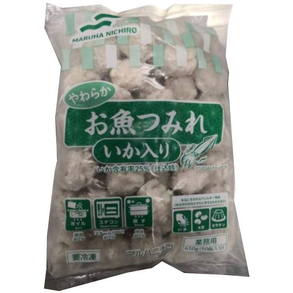 | 原材料 ※お手元に届いた商品を必ずご確認ください | 魚肉すりみ、いか、たまねぎ、いかエキスパウダー、つなぎ(でん粉、粉末状植物性たん白)、食塩、たん白加水分解物、塩こうじ/加工でん粉、調味料(アミノ酸等)、pH調整剤、(一部にいか・大豆・ゼラチンを含む) | 内容量 | 650G(50個)×6袋 |