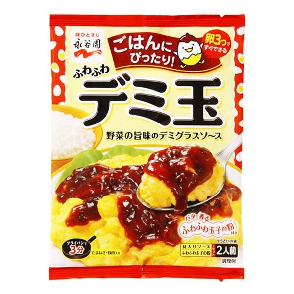 | 商品の特徴 | 子供から大人まで人気のデミグラスソースがたっぷりの玉子そうざいの素。野菜の旨味が溶け込んだ玉ねぎと豚肉入りの「具入りソース」(デミグラスソース)と、バターが香る「ふわふわ玉子の粉」のセット。卵3個とフライパン一つで簡単にご飯にぴったりのおかずができあがり、ケチャップライスにのせてデミグラスオムライスにしてもおいしく召し上がれます。 | ||