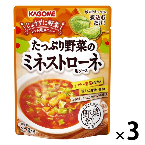 | 商品の特徴 | 炒めたキャベツと煮込むだけで簡単にミネストローネができあがります! トマトや野菜の旨みが詰まった奥深い味わいです。 カゴメの独自素材「野菜だし」を使用して野菜本来の味を存分に引き出したミネストローネ用ソースです。 | ||