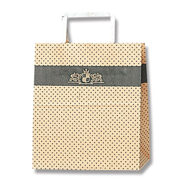 | 商品の特徴 | 茶色の水玉柄の中心に緑のエンブレムが映えるデザインです。小型ながらマチ幅が広めの人気サイズです。未使用時には紐が飛び出ていないため、在庫スペースにやさしい平紐タイプです。●手紐:平紐白●入数:50枚 | ||