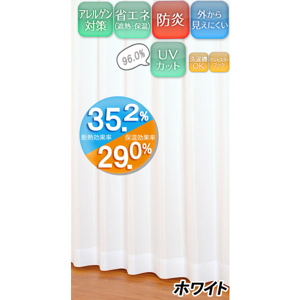 | 梱包数 | 1梱包 | その他商品仕様 | ●付属品:アジャスターフック付●機能:見えにくい、UVカット、防炎、遮熱、花粉抗アレルゲン、ウォッシャブル |