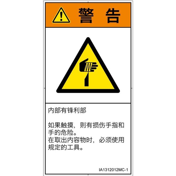 PL警告表示ラベル(ISO準拠)│機械的な危険:切傷│IA1312012│警告│Mサイズ│簡体字(タテ)│10枚 IA1312012MC-1(直送品)