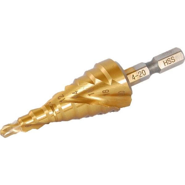 | 商品の特徴 | ●4/6/8/10/12/14/16/18/20mm 9段式●スパイラル構造(螺旋)で超高速作業を実現●チタンコーティングと屑溝付(10mm部分)で作業性をUP | ||