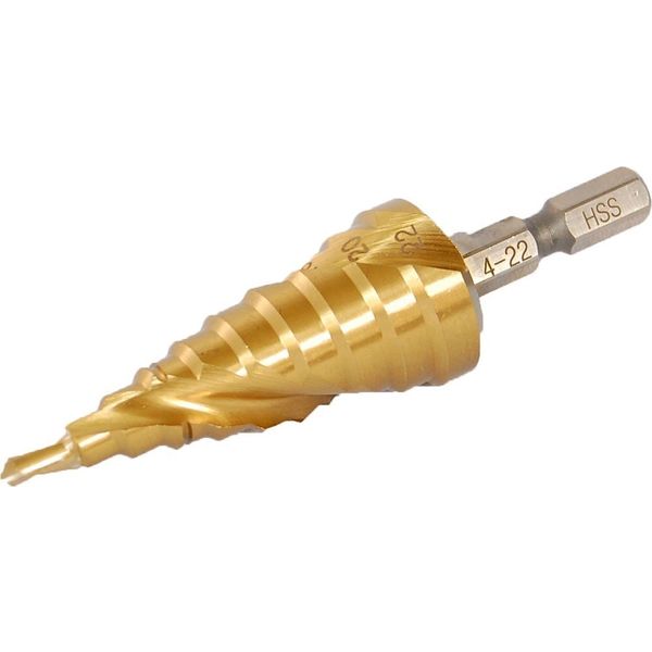 | 商品の特徴 | ●4/6/8/10/12/14/16/18/20/22mm 10段式●スパイラル構造(螺旋)で超高速作業を実現●チタンコーティングと屑溝付(10mm部分)で作業性をUP | ||