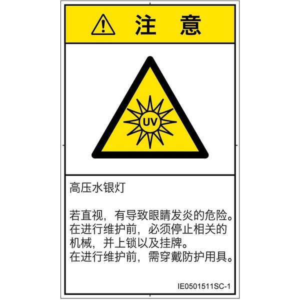 | 商品の特徴 | ●高圧水銀ランプ●直視すると、目に炎症の恐れあり。●保守前に、該当する機械を停止し、ロックアウトおよびタグアウトすること。●保守前に、保護具着用。 | ||